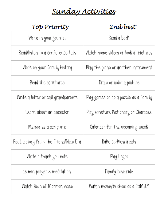 Our kids are good about treating the sabbath day different from the rest of the week. They don’t ask to do activities they know we avoid on Sundays, they have a great attitude and enjoy their day. With that being said, we felt like we could all use a sabbath day revamp. Something that would really help us refocus on what is more important and use the day to our greatest advantage. Enter our new Sunday Activities program.