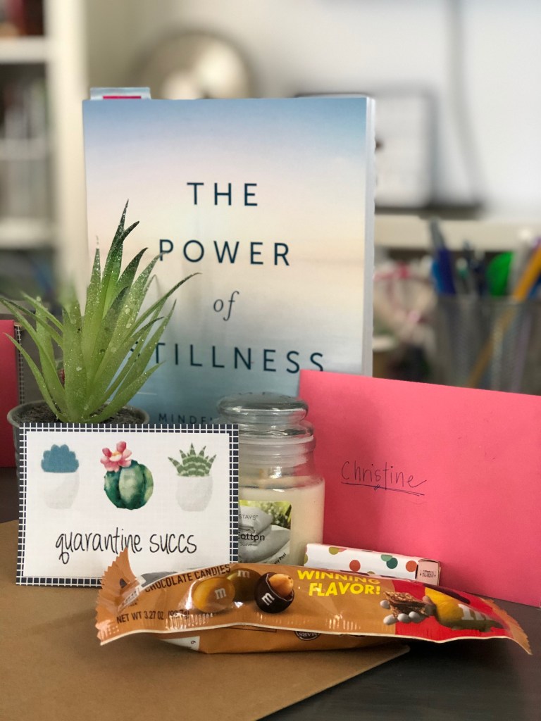 Inside the goodie bags: a succulent, candle (that smells like clean laundry so they can pretend that it’s all done and they are all caught up 😊), matches, chocolate, the book The Power of Stillness (cannot recommend this book enough. LOVE it), and then of course a little card.