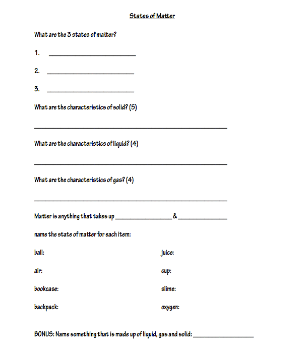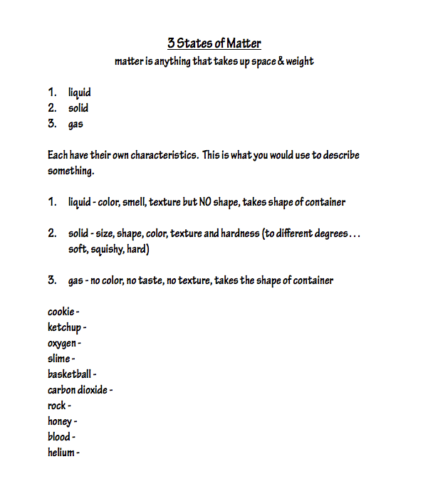 So quick and to the point: Here is a worksheet that talks a little about the states of matter and then right after that worksheet is a quiz which I will give the kids down the road. We have a couple of science experiments and games to play before we get around to taking the test.