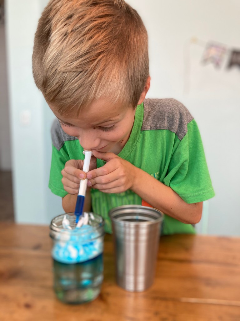 Next up was experiment time. We filled a jar with about 3/4 water then added shaving cream to the top to represent clouds. Then we had a separate cup with water in it (dyed blue with a few drops of food coloring) and we observed how long our “cloud” could hold the “evaporated” water before becoming too full and releasing the rain/precipitation.