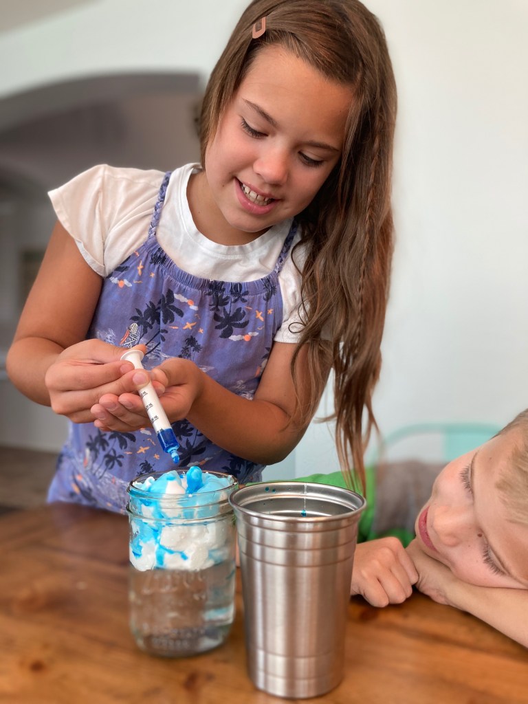 I really wish I had a dropper to do this but we worked with what we had. We couldn’t track how many drops it took very accurately but it did take majority of the syringe before you would see the blue makes its way through our cloud and into the water.