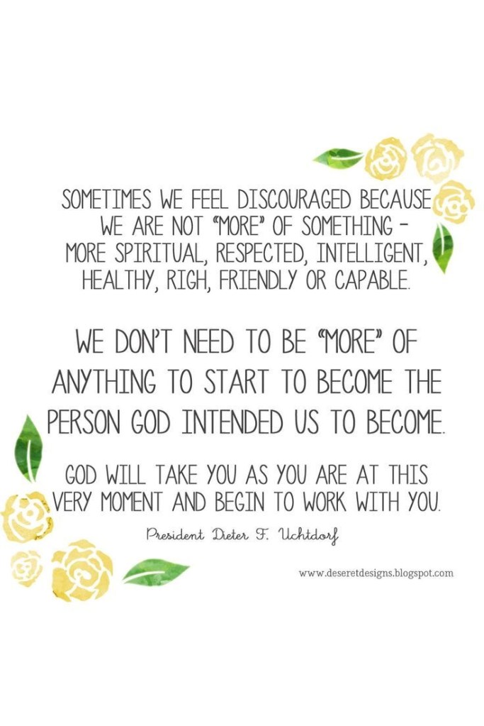 President Dieter F. Uchtdorf said, “Sometimes we feel discouraged because we are not ‘more’ of something – more spiritual, respected, intelligent, healthy, rich, friendly or capable. We don’t need to be ‘more’ of anything to start to become the person God intended us to become. God will take you as you are at this very moment and begin to work with you.” I LOVE this quote! The way I interpret that is this, if I can increase my faith a little and believe that God is willing to work with me starting NOW then I can say: