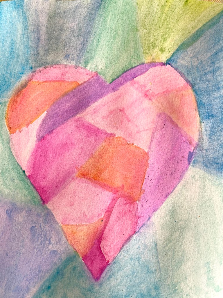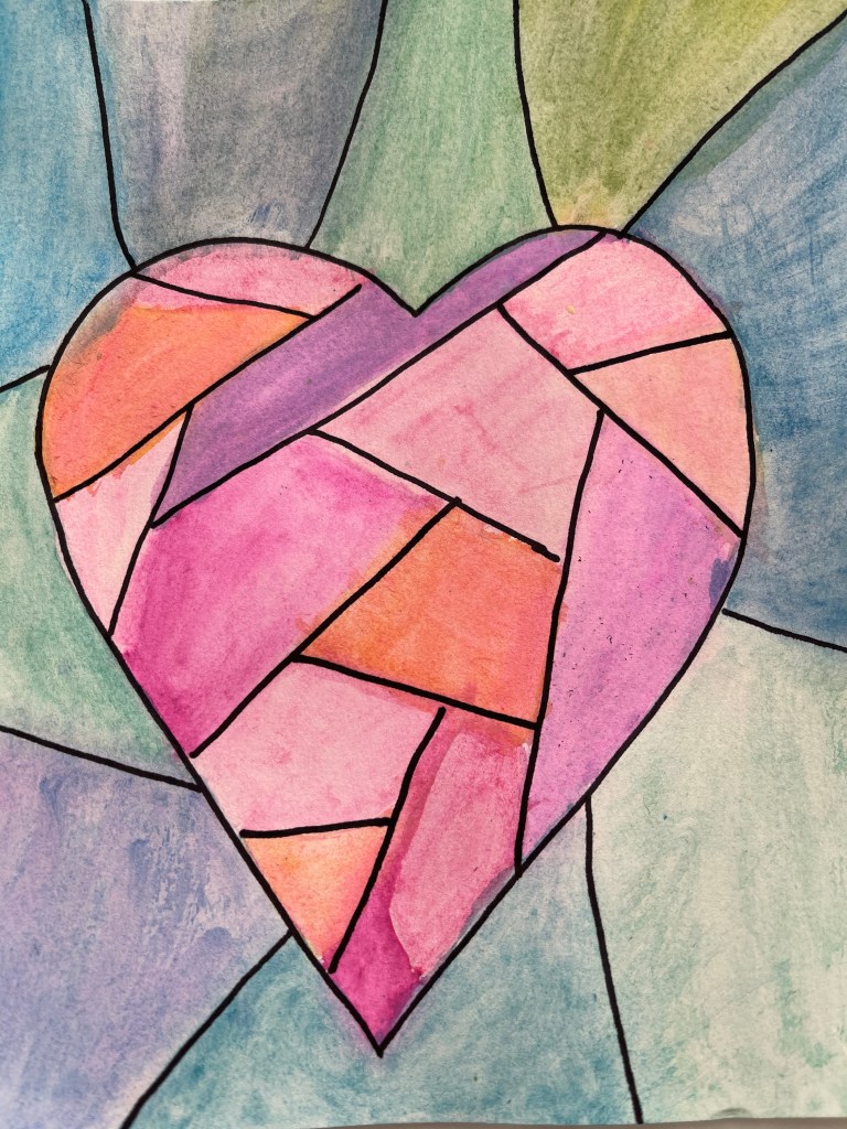 I didn’t get a picture of what we did first but you can kid of see if you zoom into the picture. First, we used a colored pencil to draw a heart….any size and anywhere on their paper they wanted. Then we drew lines all throughout the inside of the heart. Then we drew lines coming out of the heart to the edge of the paper. You are creating your “glass pieces” by doing all of this. We talked about it looking like you had a heart etched in a piece of glass and then you dropped it and it kind of shatters all throughout without breaking.