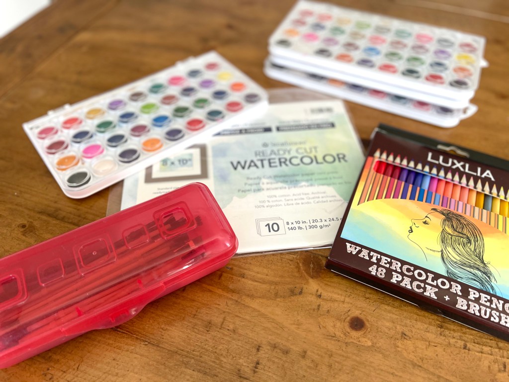 I got all of our supplies on Amazon and we got a handful since we now do art more frequently since starting to homeschool our younger kids. I love how many color options we have with this set and I definitely think the watercolor pencils are a must. To be able to have any lines blurred definitely helps give you a true watercolor look. My only warning is that the brush that came with the pencils is not great. It shed like crazy but the paint sets also came with brushes and they worked plus I had some extras on hand so it wasn’t a problem for us. Just make sure you have some other brush options if you are getting the pencils. The colored pencils themselves are great though. Your last supply needed is of course watercolor paper which is a necessity. Standard paper will get too wet and break easily, especially if you have young kids painting, they tend to soak their papers. There is a difference between hot pressed and cold pressed paper but to be honest, I didn’t do much research on that because we’re not trying to be expert watercolor artists here, we just wanted to make something pretty and this paper worked great for us.