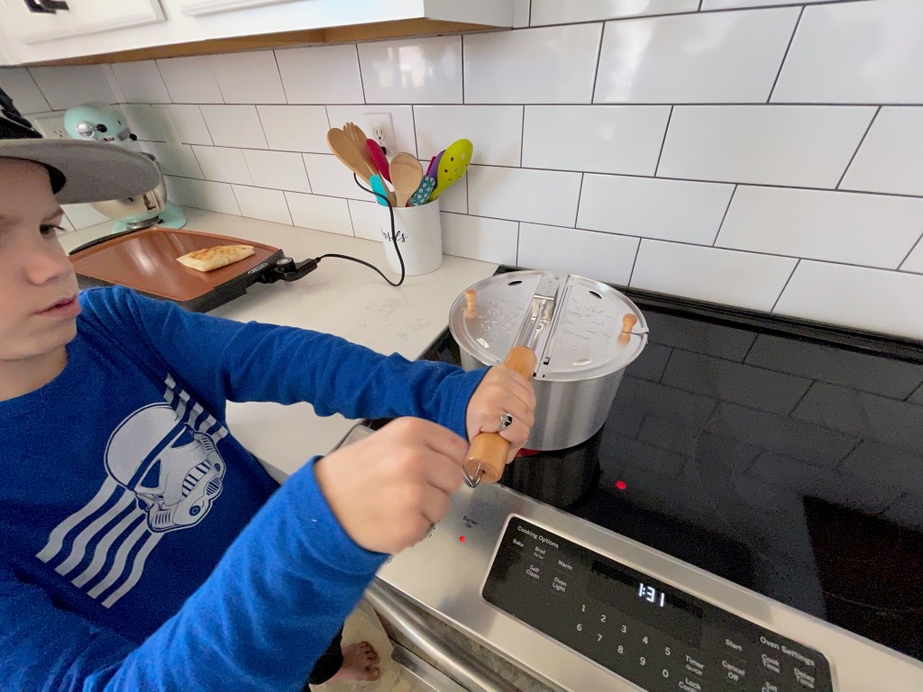 The first thing we do is pop our kernels in our stovetop popcorn popper and then pour it into a large bowl. We used 2 TBS of coconut oil and 1/2 cup of corn kernels to make this batch.