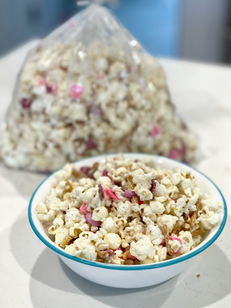 We put some in a bowl for dad and the rest in a bag for the kids to take to their sleepovers at Grandma’s. As you can see, it makes a lot! Switch out the candy and sprinkles depending on the holiday and it becomes an easy and yummy treat for kids, neighbors or yourself for anytime of the year! Hope you enjoy!