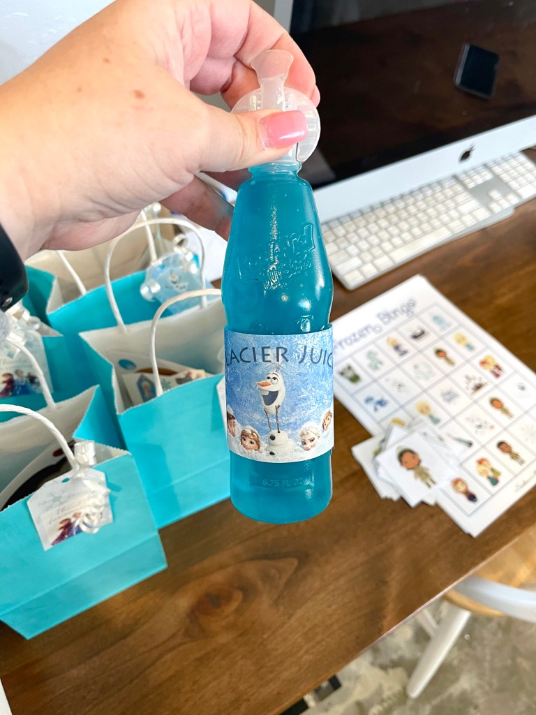 Of course we can’t forget about the thing every kid looks forward to at a party…the goodie bag! I like getting our kids involved on this part and have them help put the bags together so they learn it’s actually not ALL about them, it’s about thanking our friends for another year of friendship as well! The tags for our “glacier juice” and the “do you want to build a snowman” tags I found HERE (her post has a lot of great stuff for a fun Frozen party so read all of it!) and “Thanks for coming” tags from HERE and the Frozen make a face stickers were another Amazon find of course, as were the Frozen temporary tattoos (not pictured).