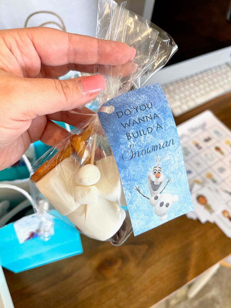 In case you’re wondering about these bags…yes, you can indeed make a snowman(ish) with the kit. We put 3 regular size marshmallows, an orange regular M&M, 5 brown mini M&Ms (eyes and buttons), 2 mini pretzel sticks, 2 toothpicks to help hold together and 2 mini marshmallows for the feet. As you can see in my daughter attempting to put it together we actually needed to add more toothpicks to hold the feet in place. So if you’re really wanting to have them be able to make a snowman that’s a little more Olaf-ish you can make it 4 toothpicks.