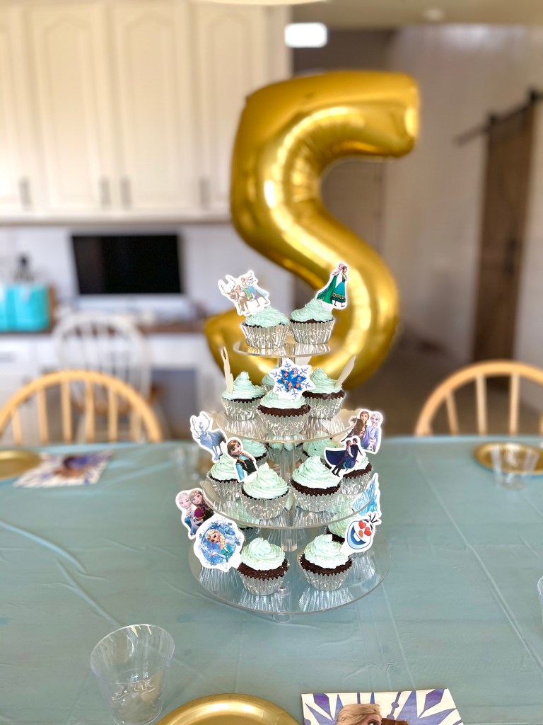 They have some amazing cake ideas on Pinterest with Frozen themes but we went with cupcakes because I wasn’t about to not let my 5 year old blow out a candle but I was trying to be respectful of others’ fears of germs. We went with store bought chocolate cake mix, the BEST homemade vanilla frosting (which we dyed blue) and some white glitter sprinkles and THESE frozen cupcake toppers. Easy peasy but goes with the theme and had Zoey all heart eyes with her cupcake stand.
