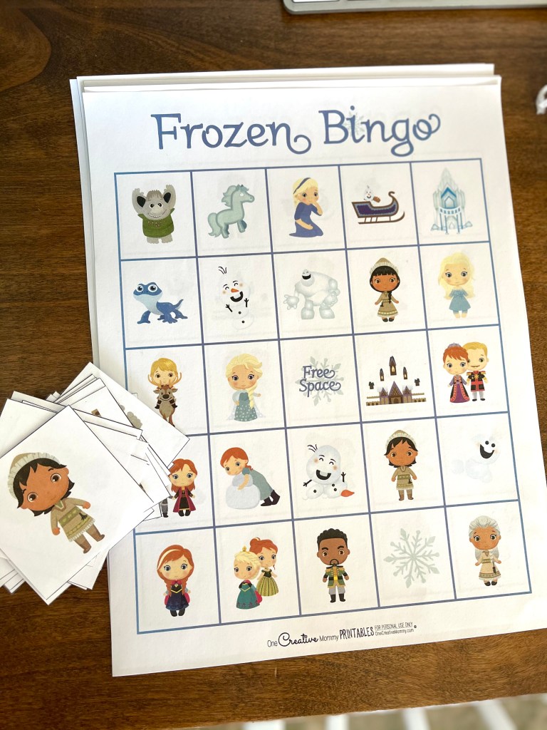 Last but not least we played Frozen 2 Bingo which I got from One Creative Mommy. Again, easy for me but SO cute and fun for kids. We used m&ms to cover our characters as we called them out because…yum!