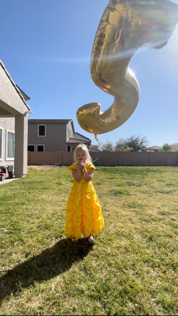We bought plates, napkins, table cloths, goodie bags (I used the mini bags in the gift bag section) and balloons all from Walmart; including the big 5 balloon which she later wrote her hopes for the next year on and we set it free (all other balloons we popped and properly disposed over thanks to big fearless brother)