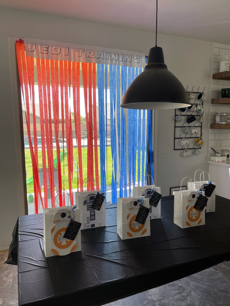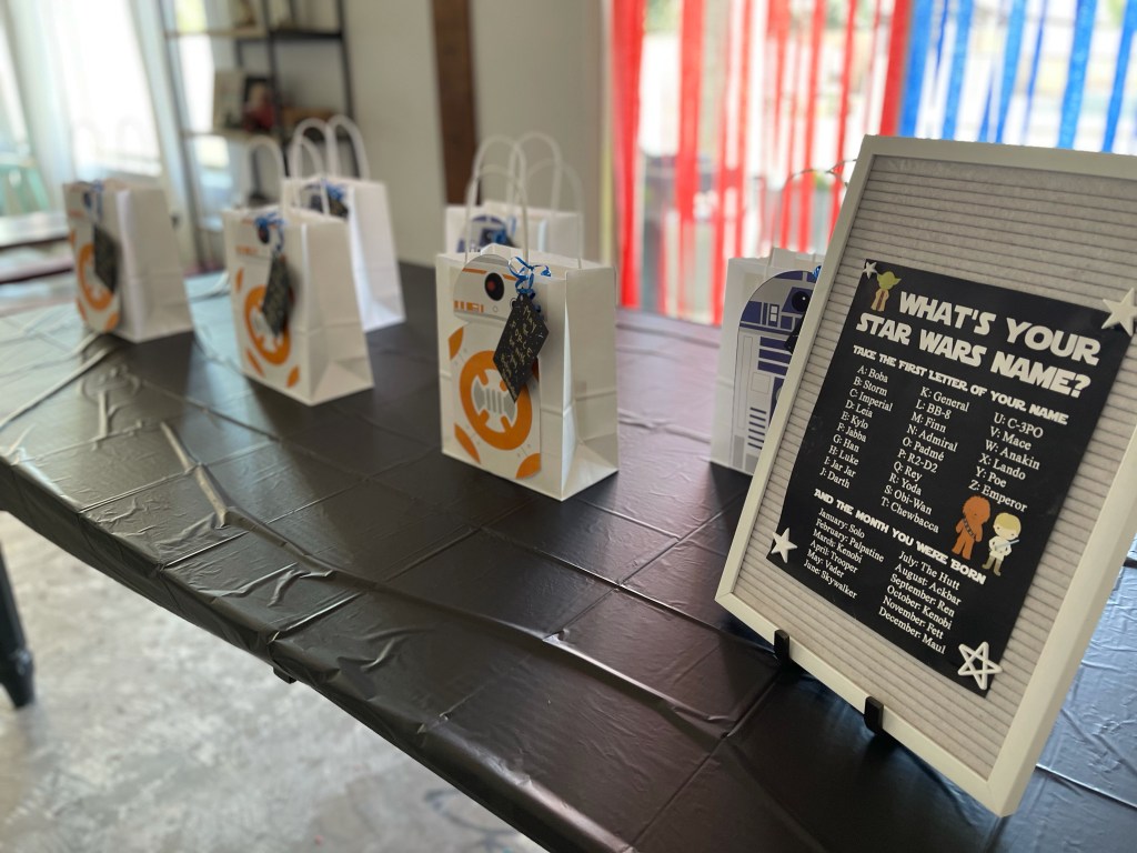 As for the goodie bags, I bought these favor bag printables and attached them to small white gift bags. Then I took black paper and used a gold metallic sharpie to write their names…and by names I mean their Star Wars name. So we purchased this printable to have them figure out their name and then find their tag/goodie bag.