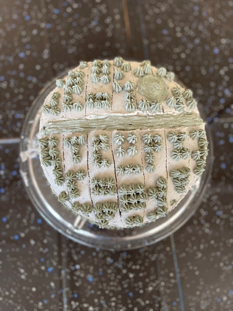 The cake was a simple box cake with THIS frosting. I looked at a picture of the death star and went to it. It’s not my best work but it was clear what I was TRYING to achieve so I count it as a win 🙂
