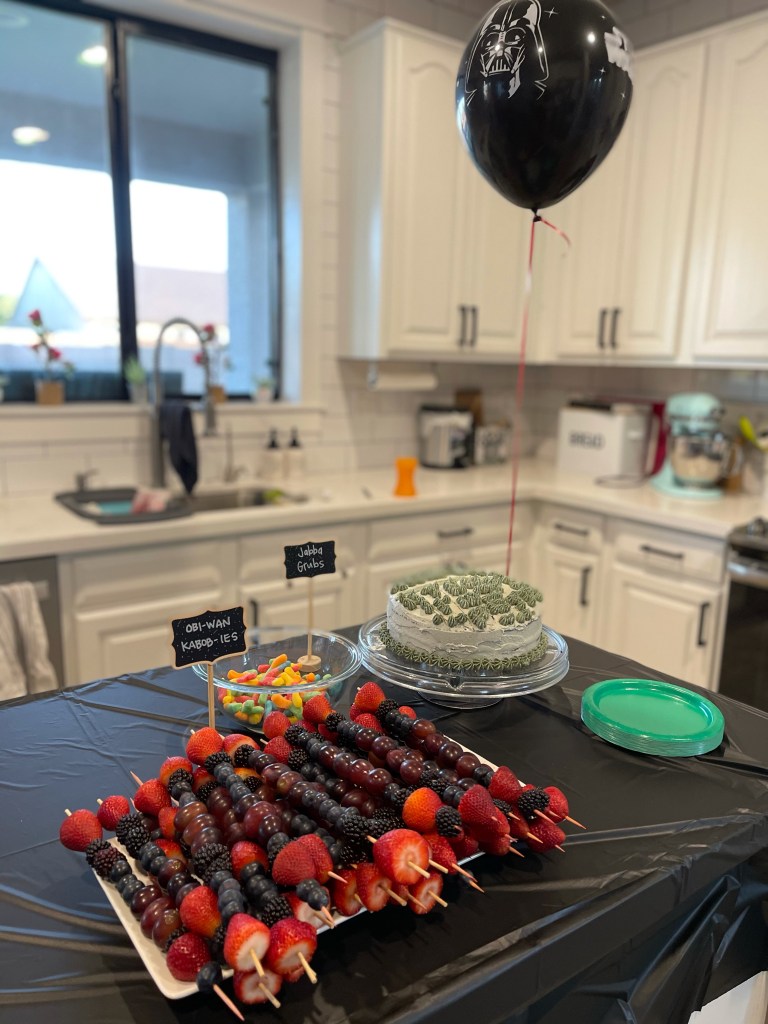 We had these Star Wars balloons on either side of the island as well as some in the room they ate in, some where he opened presents and some outside being held down with golf tees in the grass for them during their battle (which we’ll cover later).