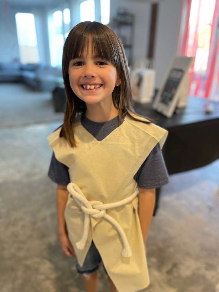 It’s kind of cracking me up that I didn’t get a single picture of the birthday boy in any pictures but I did get this one of his little sister 🙂 I bought tan material and some rope, measured the width of the shoulders of my son and of our daughter and started cutting. I honestly didn’t use a pattern or anything so I’m not going to be much help here but if you can wing it like I did, AWESOME! If not, Pinterest it, I’m sure someone has a pattern they have shared or measurements they can give to help you get an idea as to what to do. They don’t take long. I didn’t sew at all and yes, there is some fraying now (just over a month later) but I’m just fine with that. I was finishing these up just as the kids started to arrive for the party so they put them on right away and they went outside to start their Jedi training which started with making their own light sabers.