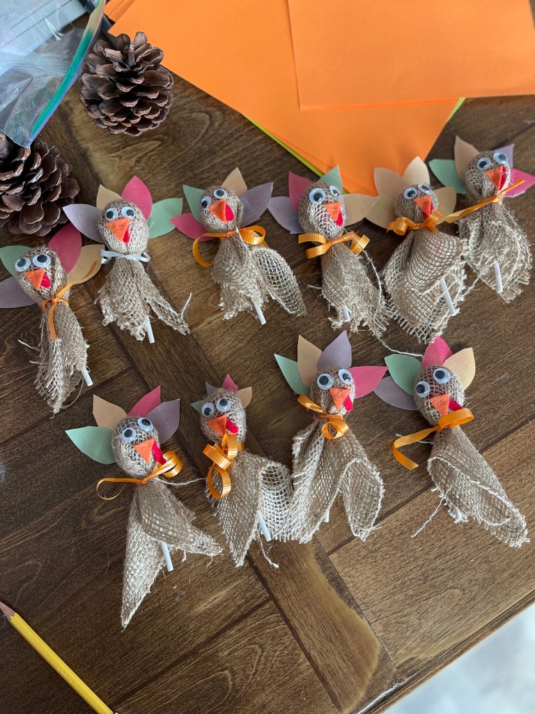 Next up was making turkey suckers that we delivered to some cousins and friends. Suckers of your choosing, googly eyes, orange and red felt, colored paper, burlap (you can also use brown or tan felt. I had burlap ribbon on hang that was the perfect size to cut into small squares), ribbon and hot glue gun.