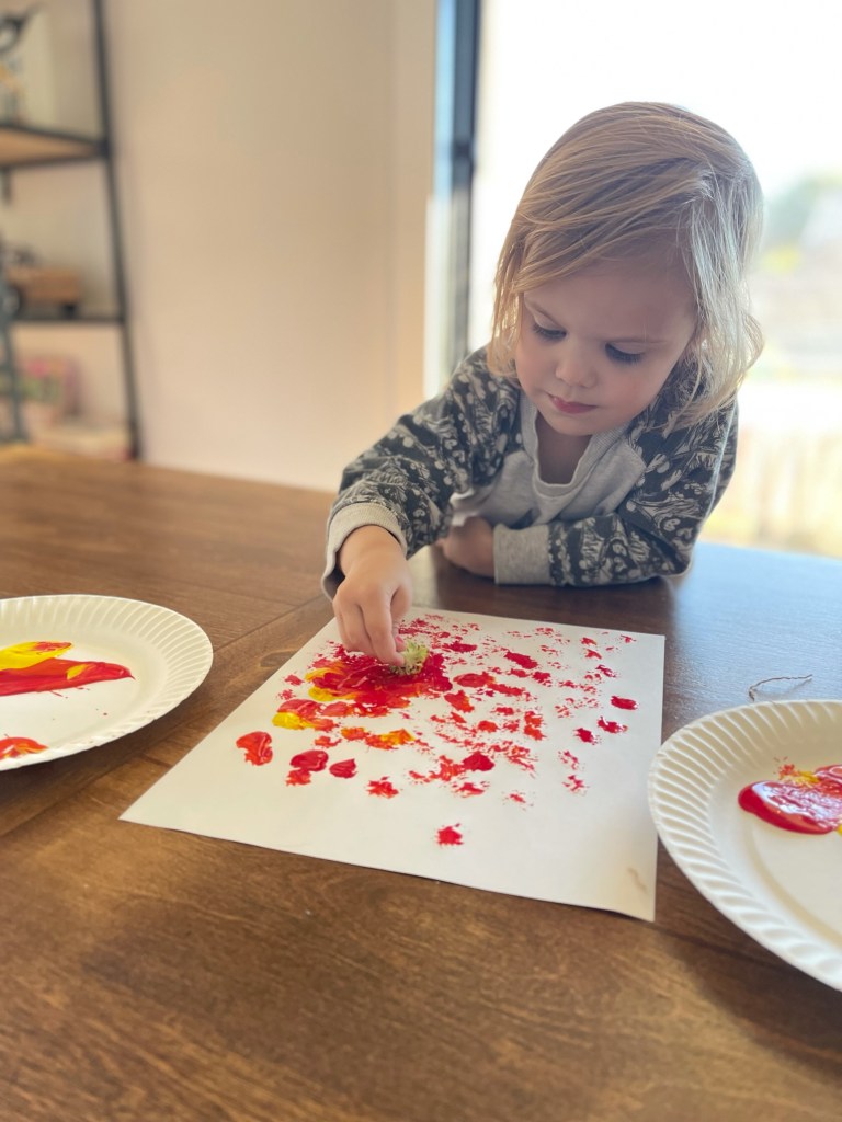 …we then grabbed a paper plate and put red, orange and yellow paint close together so that the “stamp” had all three colors on it at once. We also had three smaller piles further apart from each other to fill in some areas that needed more of just one color.