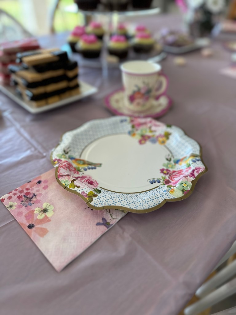 Perhaps my favorite part of the party set up were these PERFECT disposable tea cup sets! We have gone through so many plastic tea set over the years with all of our girls and they end up lost, chewed on my dogs, or they outgrow them so fast because of how small they are. Our kids take after their father and are notorious for dropping glass so the real deal was out too. I was so excited when I found this cute paper option.