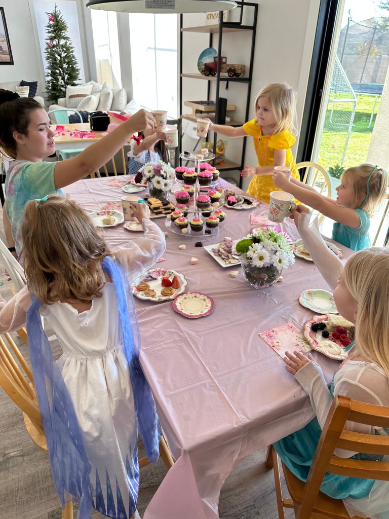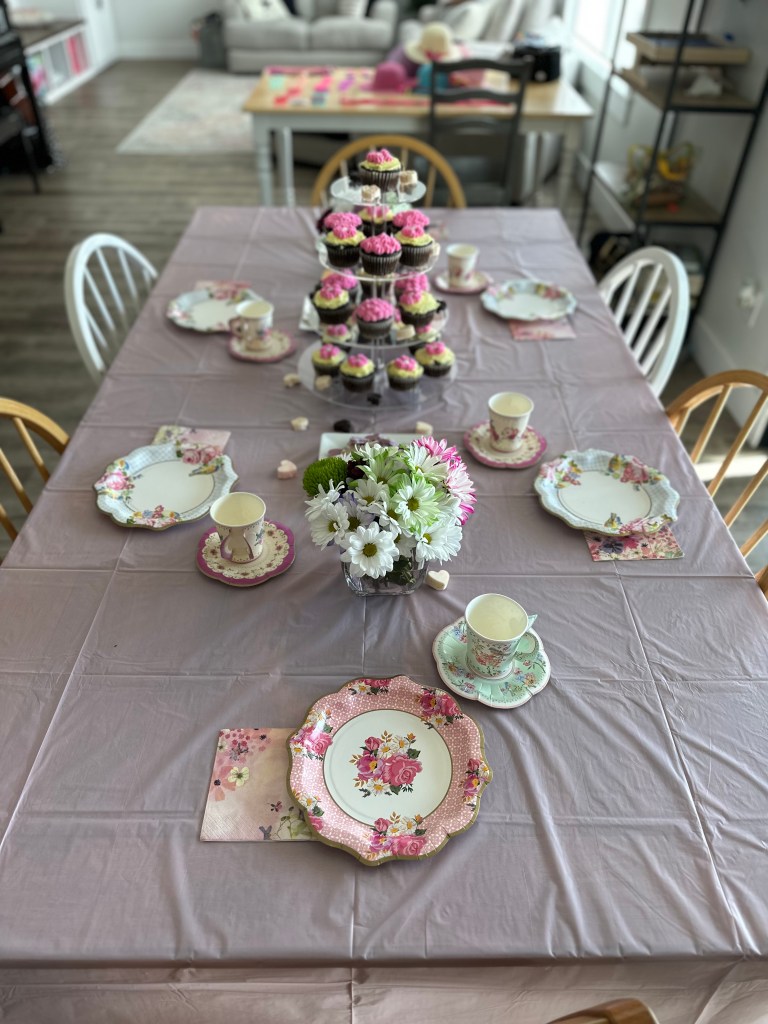 The key to a fun party, in my opinion, is to keep it simple when it comes to games and activities and find a balance of “fun themed” and “kids just want cake and presents” when it comes to the decor. Are kids usually just fine with cake, presents and some friends over? Sure! And some years that’s what our kids’ parties look like. But there is nothing quite like the look of awe and excitement on your kid’s face when they come downstairs and we do the reveal of the decorated space for their party. And the excitement leading up to it as they watch you put things together for their upcoming day of celebrating them. I LOVE it! With that being said, no need to go over the top, because again, they just want their friends to come celebrate THEM for a day. Balance, right? Well…here is what my version of a balanced tea party looks like 🙂