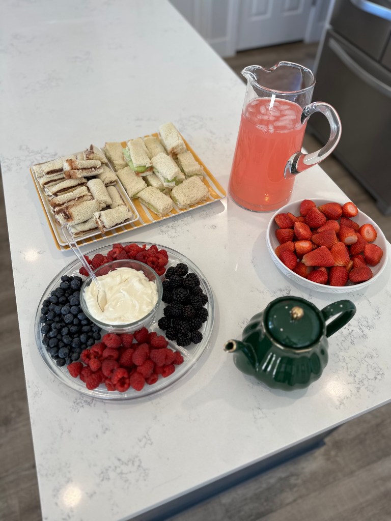 All the items we walked around and served them. Fruit with an option of dip to go with it. This is our favorite fruit dip that we make and enjoy multiple times a year because…YUM! Always love an excuse to make it! We also offered 2 types of finger sandwiches: the traditional cucumber or Nutella. For the cucumber sandwich I kept it simple and bought a container of pre-made tzatziki and spread that on bread with some thinly sliced cucumbers and called it good. Here is a recipe for the more traditional way of making a cucumber sandwich. We also walked around with this adorable tea kettle to pour them their “tea” which was actually pink lemonade, birthday girls choice. 🙂