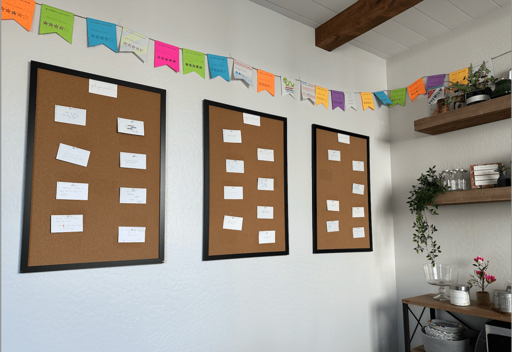 Our goals have become more ambitious as the kids get older due to there being such a wide range of ages. So we introduced our reading banner! We made a goal last summer to make the banner reach across our longest wall in the dining room, which also happens to be where we do home school, but turns out that was way to easy so we upped it this year. We started at the beginning of the summer and there is no deadline this time, but when we hit 50 books read we’ll go out as a family to get ice cream. When we hit 100 books, we’ll do a family trip to Fat Cats for an afternoon of family fun.