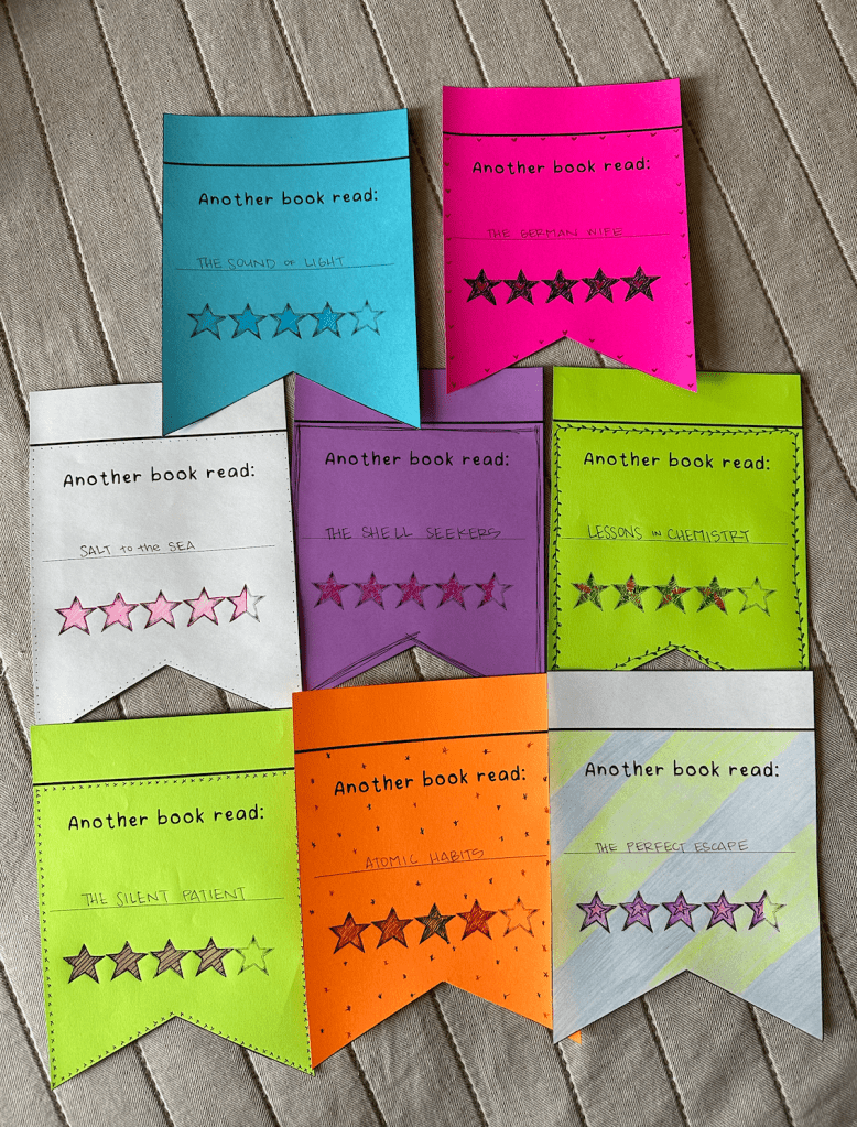 I printed them on color paper to make it easier for me. Sometimes we embellish the colored prints and sometimes we full on color/design the white ones and other times we keep it super simple. I keep a large stack printed, cut, and ready to be hung within easy reach of everyone so we can immediately fill one out when we’ve finished a book.