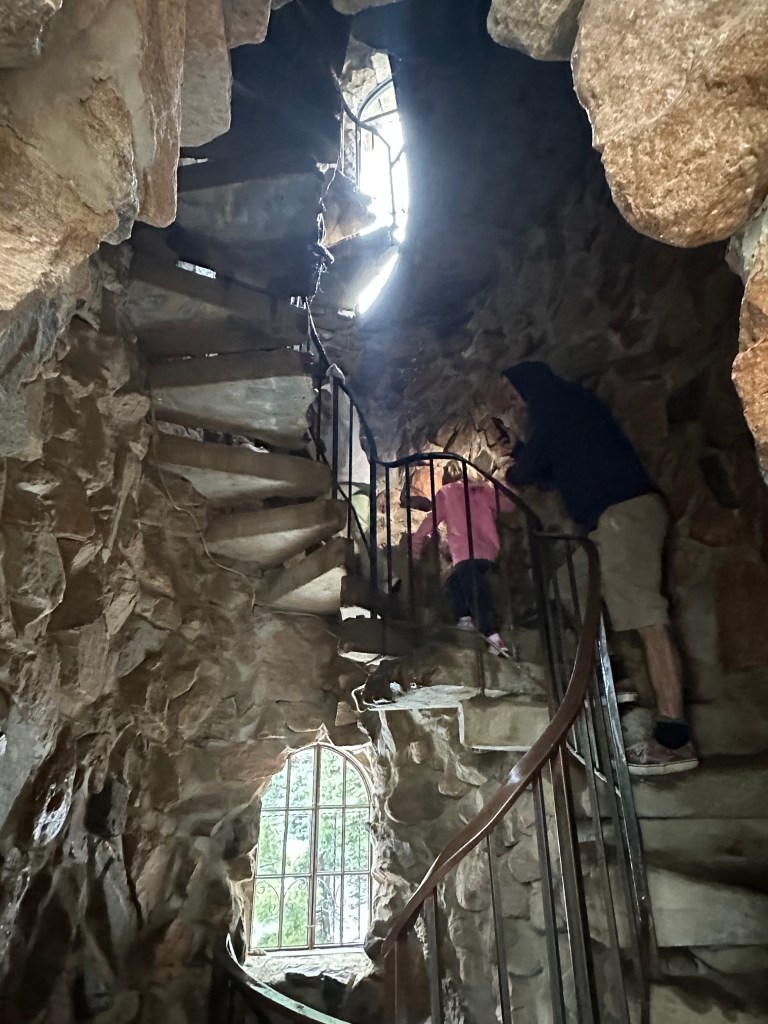 Not a working bell but cool to come across all the same. This treasure is found as you starting climbing to the highest peak. This is where it started to really get wet. There are places during this climb that have STEEP drop offs where full length windows (maybe they are even meant to be doors eventually?) are completely open. Around this time is when my husband started to feel a little uneasy with our youngest children and took them back down. The oldest two and myself continued to make our way up very slowly and carefully.
